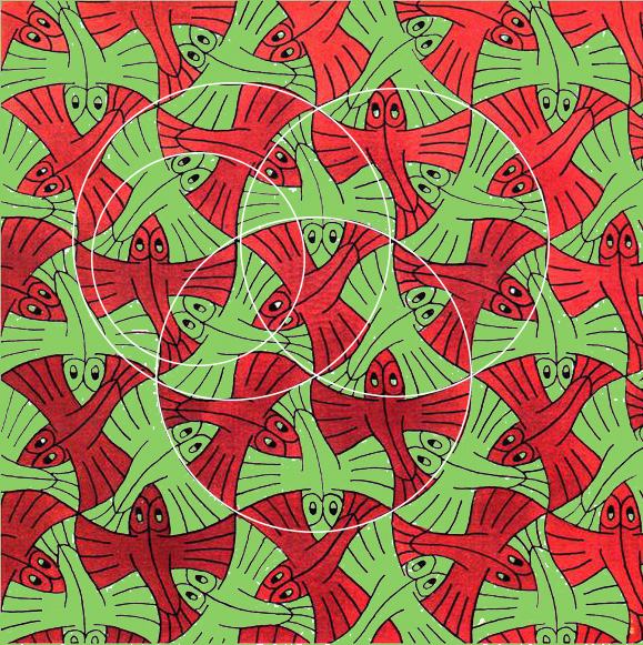 Precision is critical when designing floor tiles or jigsaws. Merely tracing this image could lead to disaster. So I recreated Escher's design in CAD- note the triangular lattice and circular unit cells (remember, Escher worked in an era of straight edges and compasses):